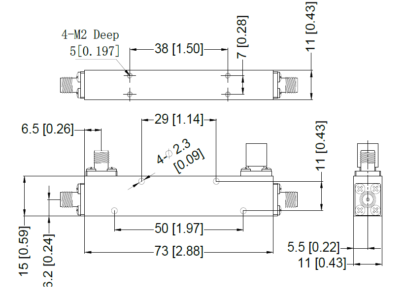 - Вносимые потери: 0.4 дБ тип, 0.6 дБ макс